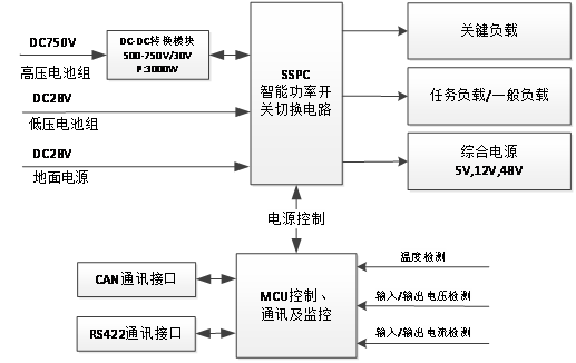 BPMS3000系列無人機(jī)配電管理機(jī)將飛機(jī)高壓直流電源轉(zhuǎn)換為DC28V低壓直流電源,為飛機(jī)航電設(shè)備供電,是飛機(jī)低壓母線主要電力來源。應(yīng)急電源負(fù)責(zé)在高壓電源故障時(shí)的整機(jī)應(yīng)急系統(tǒng)供電,實(shí)現(xiàn)無人機(jī)的應(yīng)急返航和著陸。應(yīng)急電源與高壓電源和地面電源進(jìn)行并網(wǎng)使用,電源輸入和輸出經(jīng)由SSPC智能功率開關(guān)進(jìn)行切換和控制,滿足飛機(jī)不同工作模式下的供電要求。地面調(diào)試由地面電源供電,正常飛行時(shí)由高壓電源經(jīng)DC-DC轉(zhuǎn)換模塊變換成DC28V對(duì)全機(jī)供電,DC-DC轉(zhuǎn)換模塊故障時(shí)由低壓鋰電池組供電。MCU電源管理控制電路負(fù)責(zé)接收飛控計(jì)算機(jī)的指令,電源管理系統(tǒng)的運(yùn)行狀態(tài)監(jiān)控,電源系統(tǒng)控制、保護(hù)和顯示,并對(duì)各種信號(hào)進(jìn)行處理以及數(shù)據(jù)傳輸以及功能切換等,以滿足飛機(jī)各種負(fù)載條件下的用電需求。
